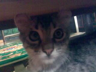 Haha.. funny lah my mom. When he came jek, nk pi toilet.. lolx. We watch ceramah on my laptop..then watch a VCD movie halfway..pastu tgk2 friendster. Kalau ada tetamu, abg asyik bau2 orang..lagi2 Irwan. Haha.. Abang ni hyperactive.. cawan orang nak bau, muka orang nak bau.. Pas2, Puteri plak baru bangun, keluar dari bilik. Terus Putri gi kat Irwan, sleep on his lap.